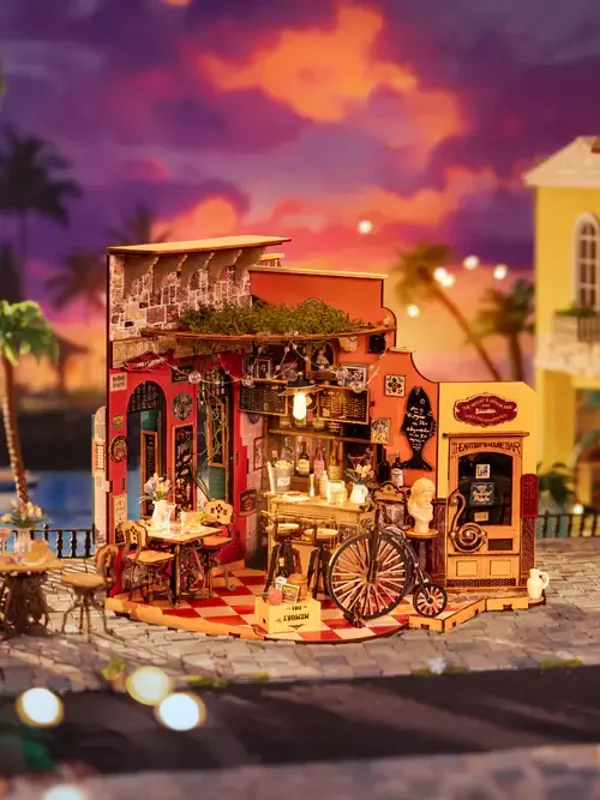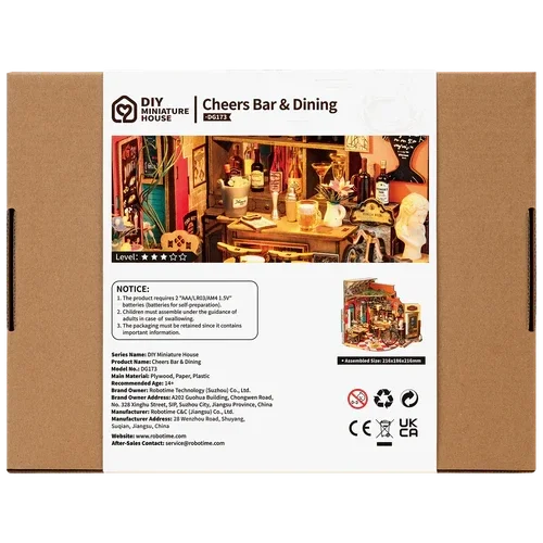 Model: Miniatuurhuis Cheers Bar & DiningMethod: MiniatuurhuisAssembled Size: 21.6 x 18.6 x 21.6 cmNumber of Pieces: 312Assembly Time: ongeveer 5 uur